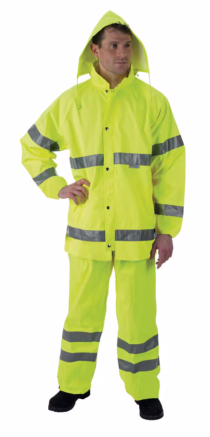 Class III PVC, Coated Polyester Set, ANSI 107-1999 class 3, Water proof and wind proof, Two lower slash pockets, Two pass through slash pockets on pants, Adjustable pant legs, Back ventilation